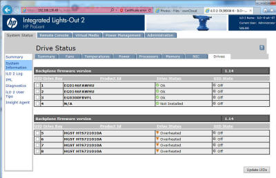 Перші 3 є справжніми дисками HP у лівій частині відсіку, а нижні 4 - не-HP диски, які, здається, перегріваються. Коли ви тягнете привід і відчуваєте його, диск трохи теплий, але ніяк не близький 61C (Фактично свідчення термодатчиків є помилковими).