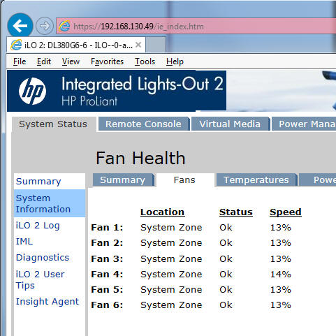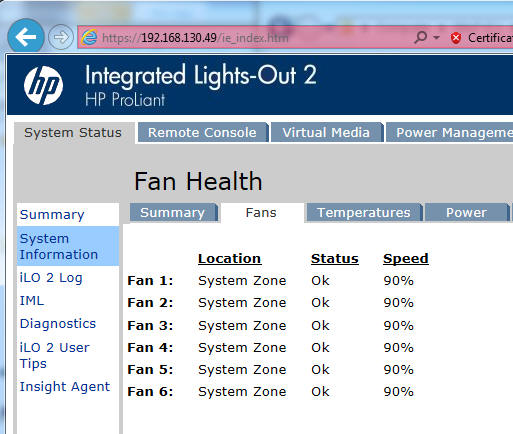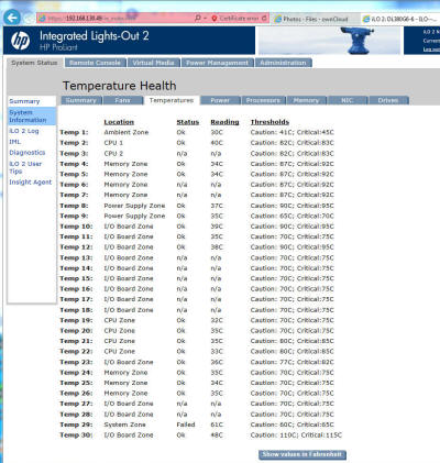 Якщо ви подивитеся на вкладку температури ILO, датчик температури 29 може з'явитися поблизу перегріву (55-58 ° C) або як показано тут, що датчик може показувати рівень застереження і стверджувати, що він не працює:
